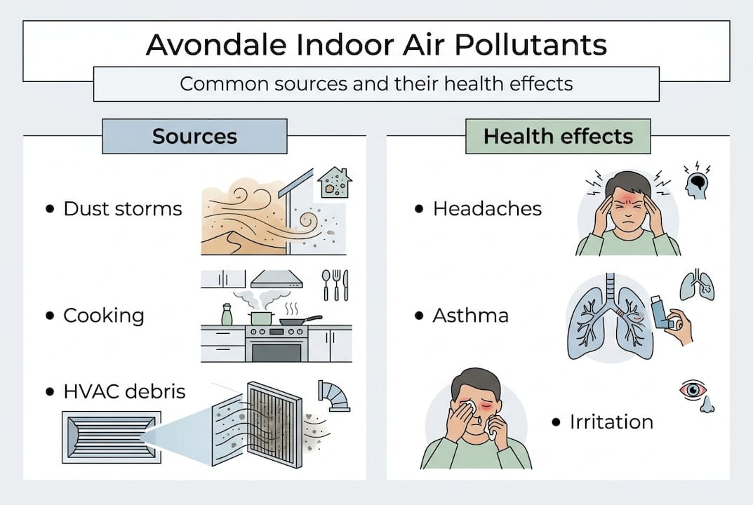 Poor indoor air quality is linked to headaches, fatigue, eye and throat irritation, worsened asthma, and long-term respiratory disease. In Avondale, common pollution sources include outdoor dust blowing in through gaps, ozone from vehicle traffic, and VOCs from household products used in tightly sealed, air-conditioned spaces.