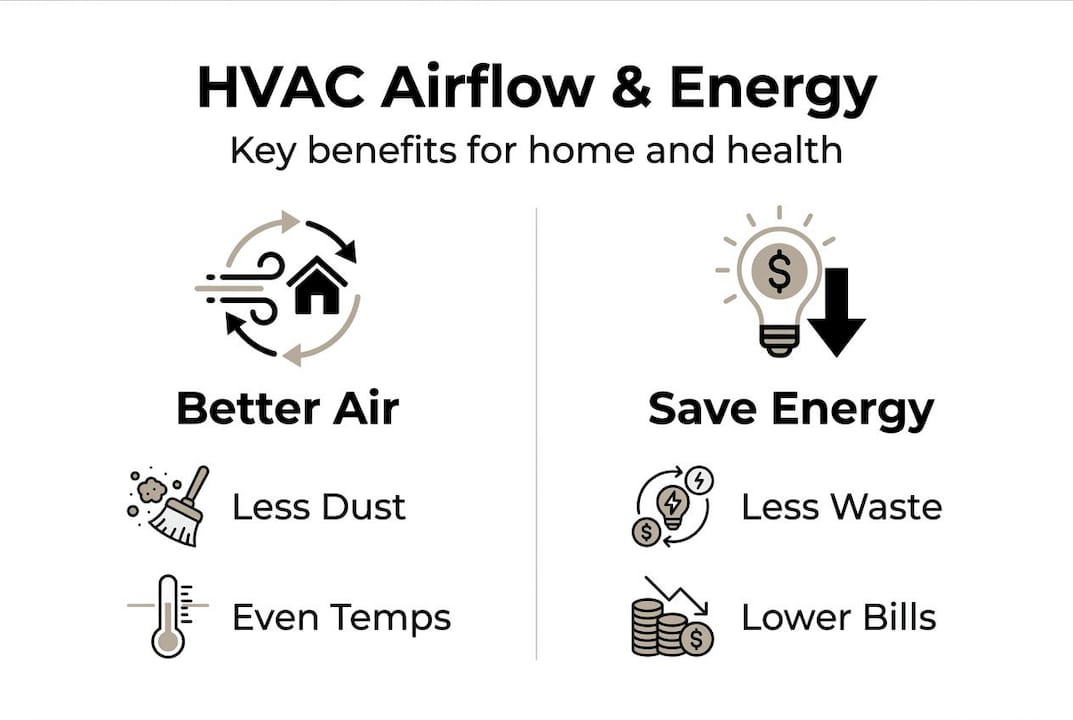 | Balanced airflow boosts health | Proper HVAC airflow ensures clean air and a comfortable indoor environment. |