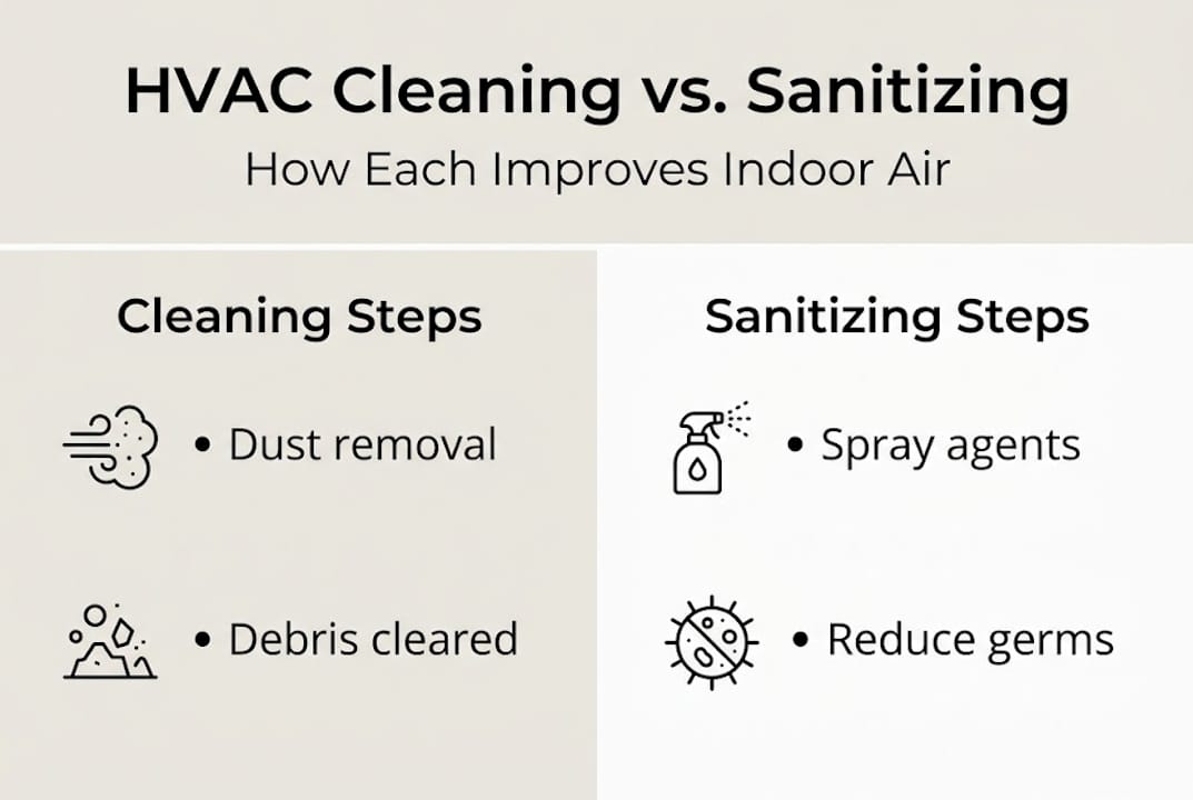 HVAC sanitizing is not the same as HVAC cleaning. Cleaning removes physical debris, dust, and buildup from inside your ducts and system components. Sanitizing comes after that step. It means applying an EPA-registered chemical agent to the interior surfaces of your ductwork to reduce bacteria, mold spores, and viruses that may remain even after a thorough cleaning.